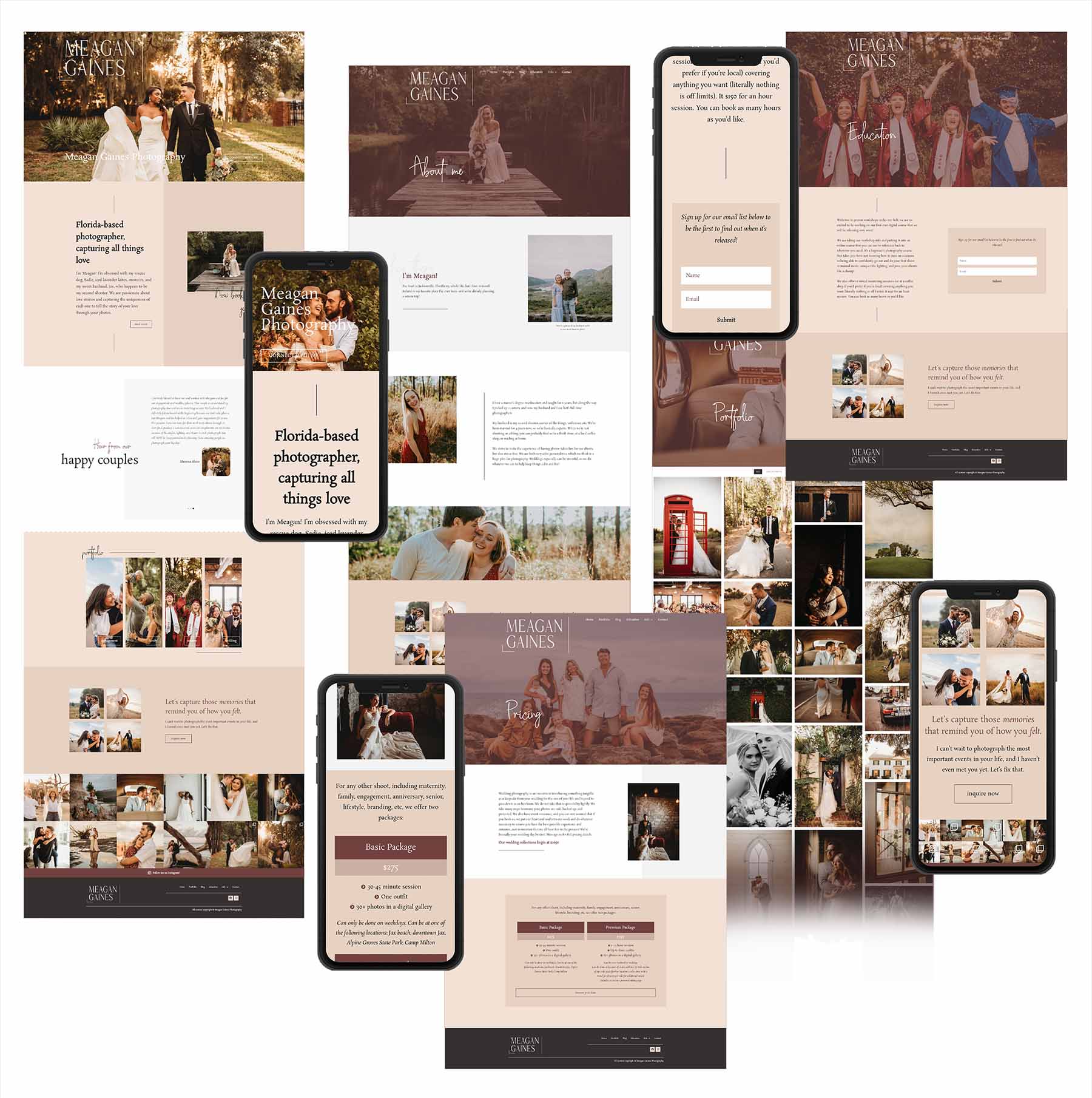Meagan is a photographer whose SquareSpace site expired, and she needed something easy and professional where she could blog and showcase her portfolio. Her brand is very soft, warm, and friendly, and I wanted to use colors and a style that would portray ease and comfort.